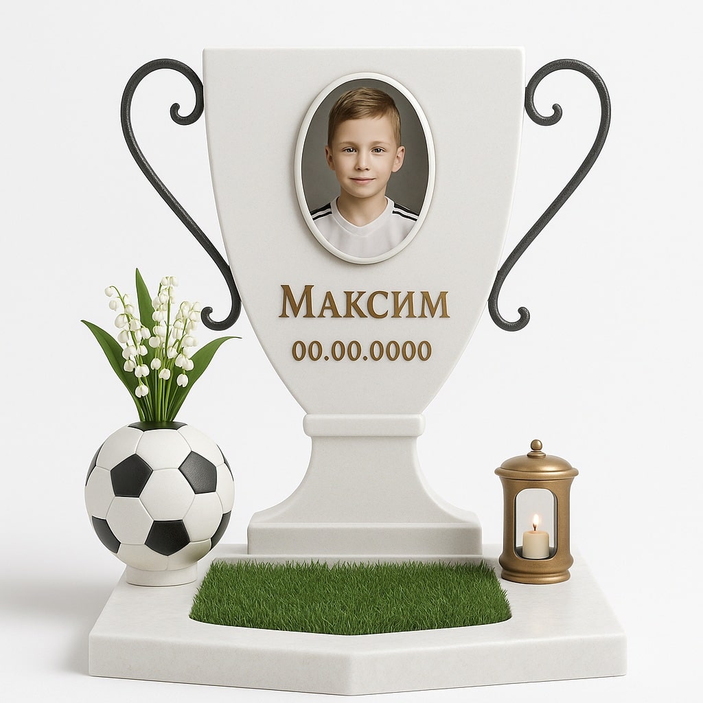 Оригинальный памятник, выполненный в форме трофея, символизирует силу, стремление и любовь к спорту. Модель оформлена в бело-чёрной гамме из натурального камня и дополнена тематическими элементами, передающими характер ребёнка.
