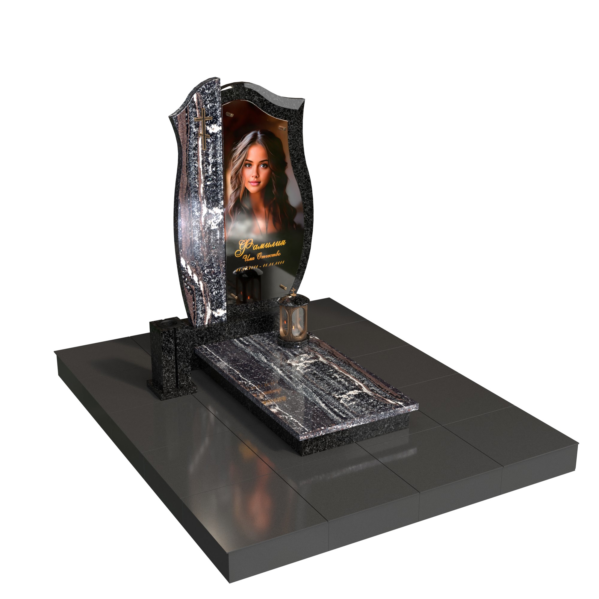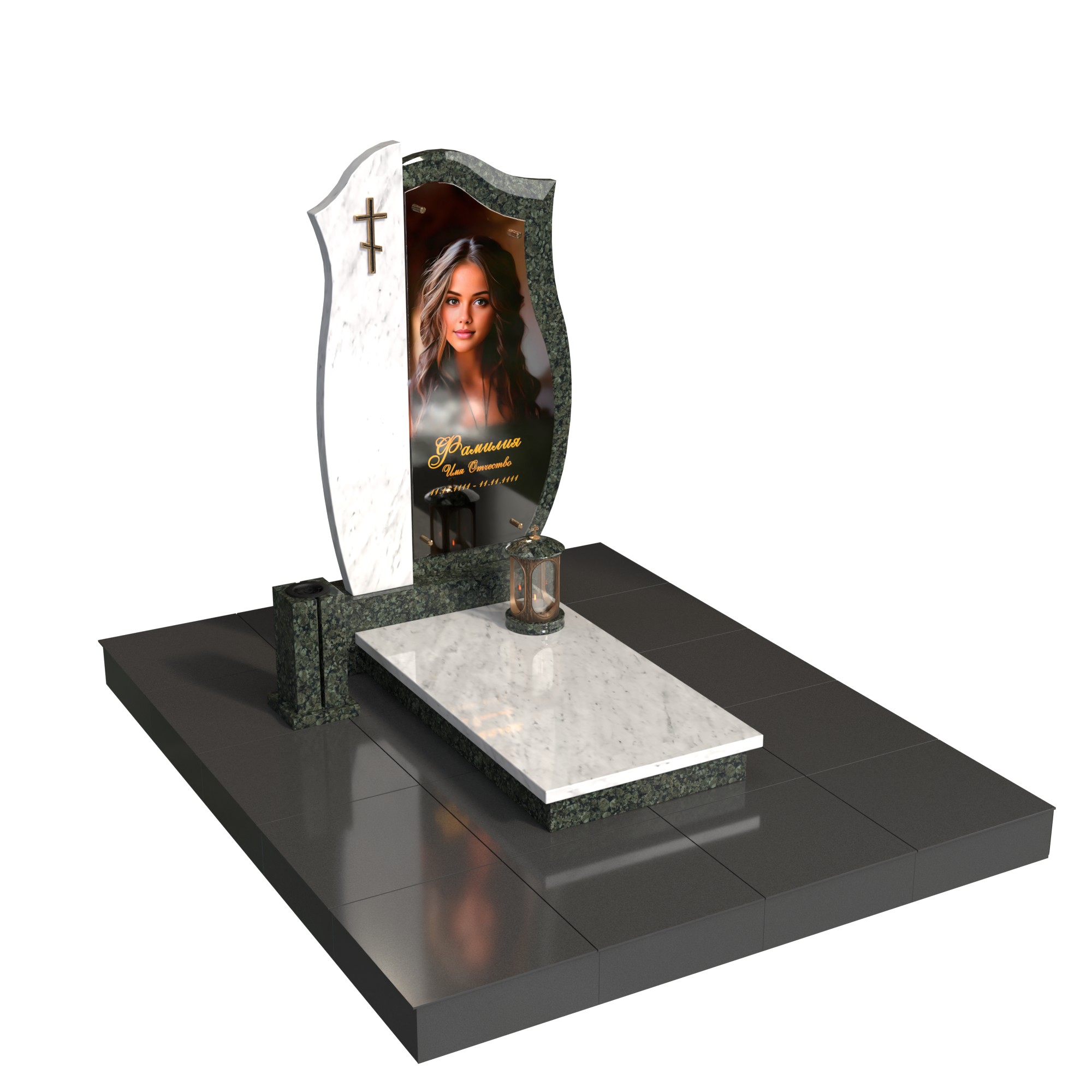 Комбинированный памятник «Небесный щит» выполнен из натурального гранита и белого мрамора. Фигурная стела в форме щита с аккуратным крестом и фотопортретом на стекле создаёт торжественный, но очень тёплый образ. Полированная мраморная плита на гранитном основании подчёркивает контраст материалов и долговечность комплекса: он устойчив к морозу, влаге и выцветанию, десятилетиями сохраняет первоначальный вид.