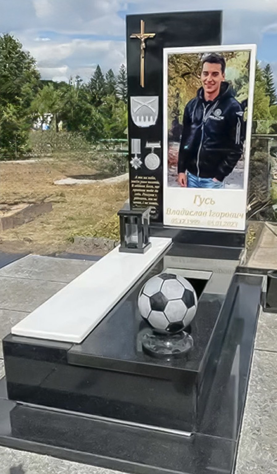 Оригинальный комбинированный памятник из белого мрамора и чёрного гранита создан для увековечения памяти о человеке с индивидуальной историей и увлечениями. Вертикальная стела выполнена с рамкой из натурального мрамора, в которую вставлено стекло с полноформатной фотографией. Композиция дополнена барельефами с наградами, бронзовым крестом, декоративной лампадой и скульптурой футбольного мяча, подчёркивающей личные интересы усопшего.