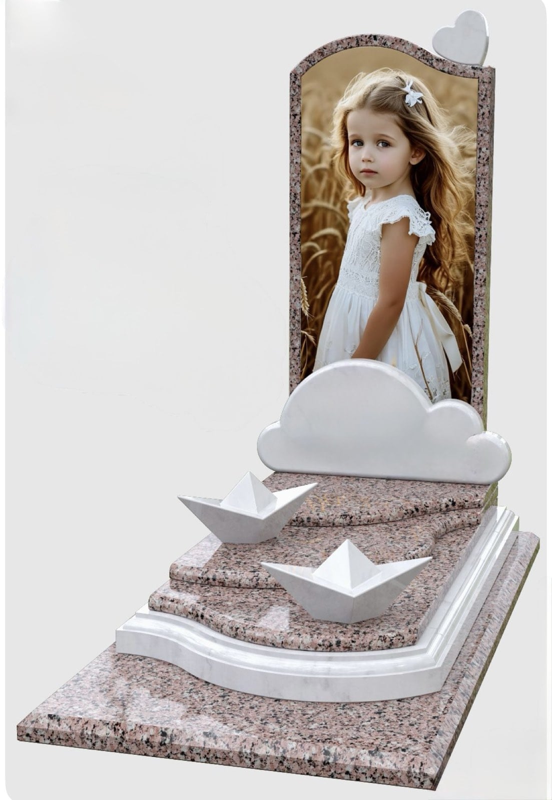 Нежный детский памятник, выполненный из розового Междуреченского гранита с декоративными элементами из коелгинского мрамора. Стеклянная вставка с фото, мраморное облако с местом для ФИО и дат, а также два бумажных кораблика придают композиции светлый, трогательный характер.
